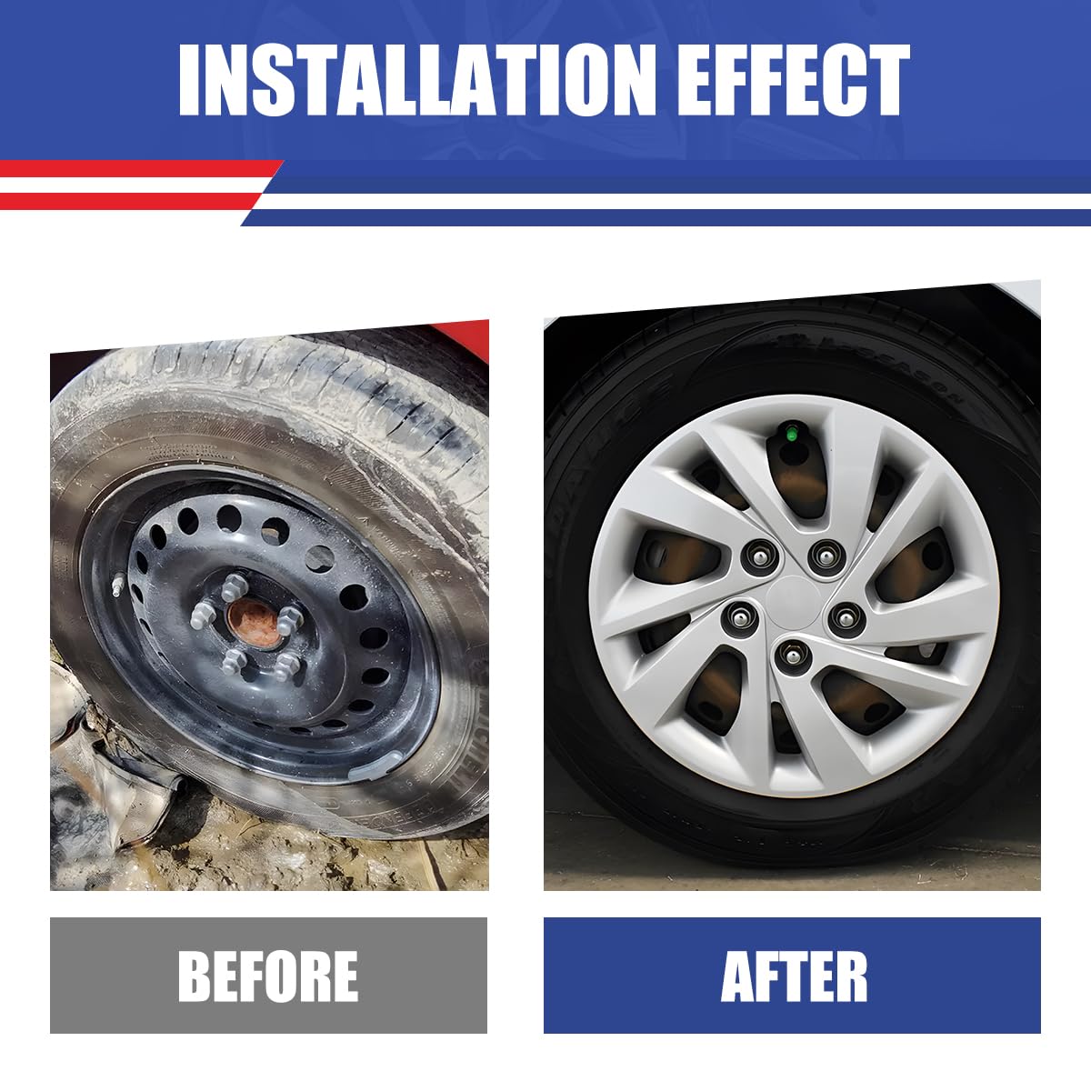 - â ăEasy To Installă: With a quick and easy snap-on replacement, our hubcaps are easy to install. Just place them on the tire and snap them into place, Locate the curve on the retention ring and match to the tire air valve to install.