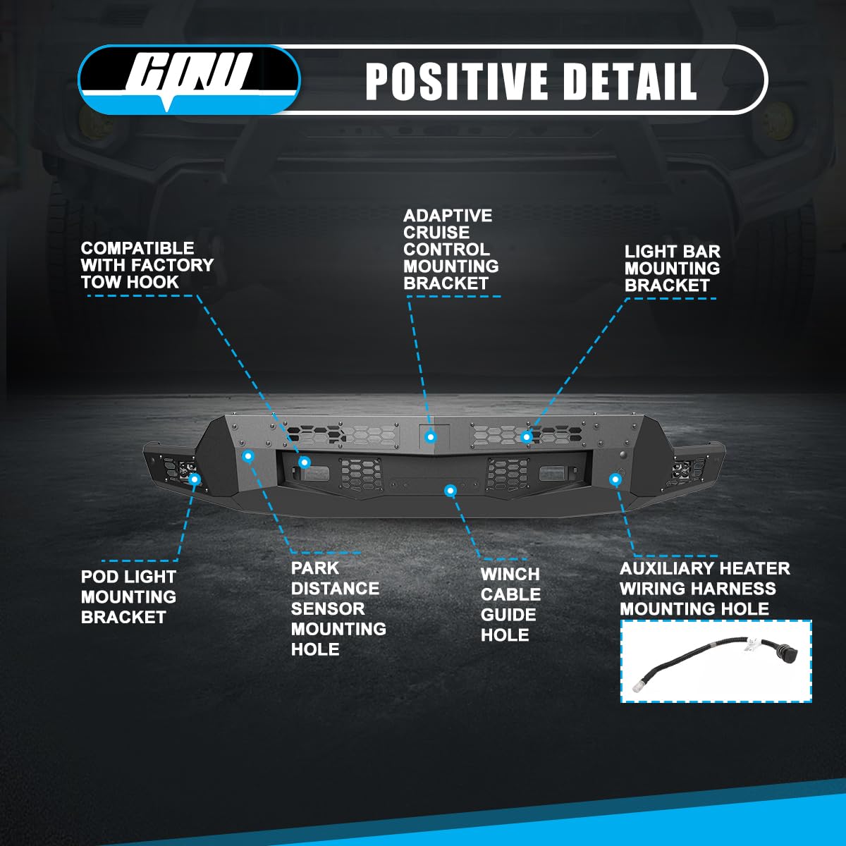 - â ăModular Design Functionă Modular design front bumper which makes you flexibly install the bull bar, skid plate and winch plate according to your needs. This unique modular design gives you enough freedom to flexibly customize your bumper according to your own personal style. At the same time, it also facilitates future upgrades, repairs, or replacement of parts.