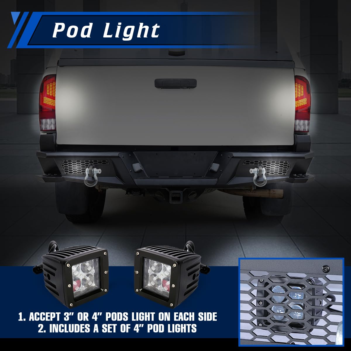 CPW Full-Width Rear Bumper Fit For 2005-2015 Toyota Tacoma, Steel Round Tube Rear Bumper w/D-Ring Shackles & 2 x 4'' Pod Lights, Bumper For Tacoma w/Stepped Platform, Work With OEM License Plate Lightâ