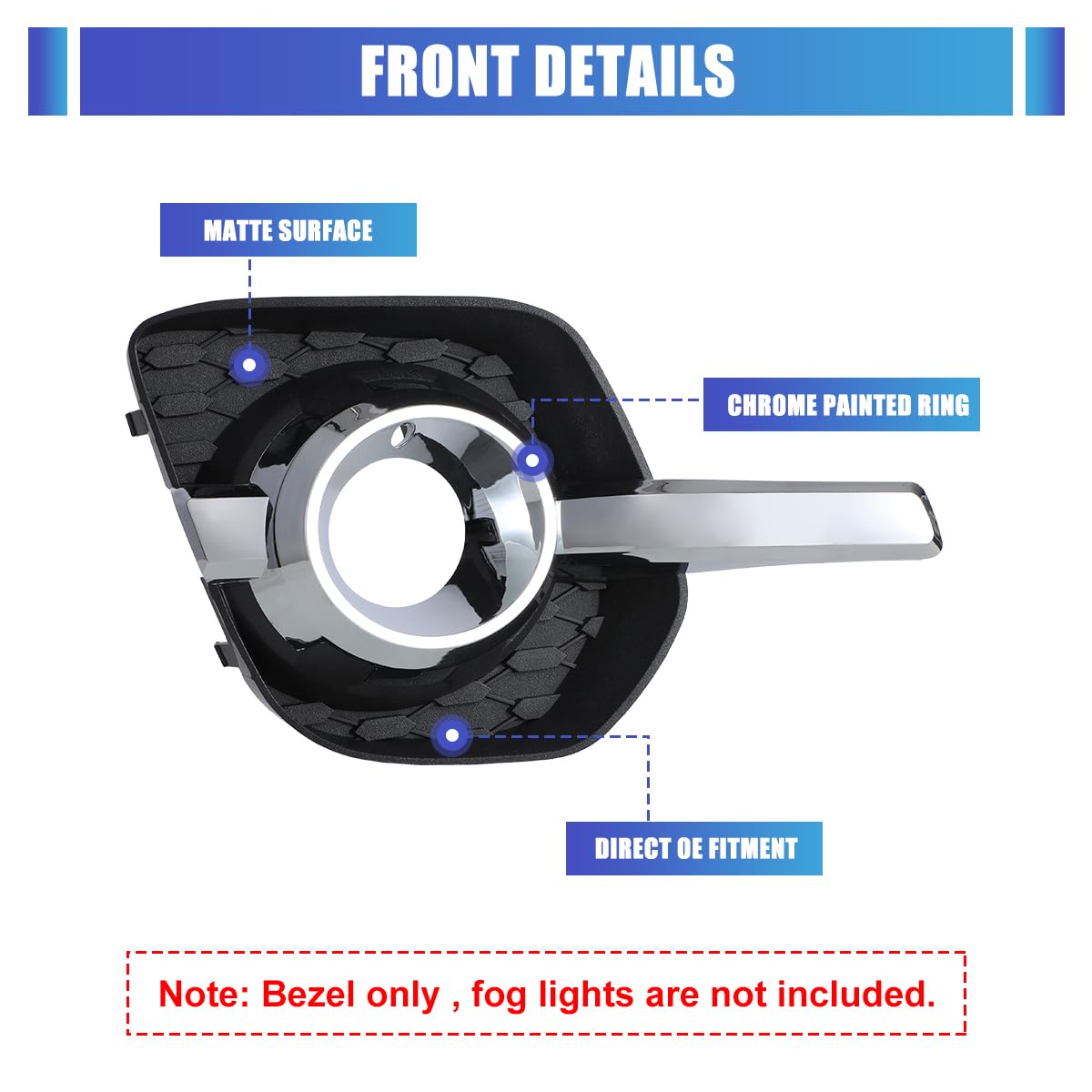 - â ăEasy Installation, Plug & PlayăAll parts are SAE and DOT approved, meet with standard safety and OEM requirement. Fog Light Bezels perfectly replace factory parts and are designed for quick and easy installation without drilling or modifications, Just Clip it On And Ready To Go.