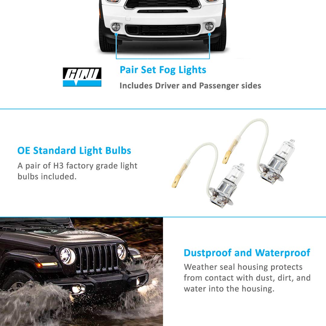 - ðãEnhance VisibilityãFog lights increase safety during night time, heavy rain, snow, or dense fog. The clear lens ensures maximum illumination, and the fog light assembly with the high seal has a good waterproof dust-proof function, it can provide great visibility in fog weather.