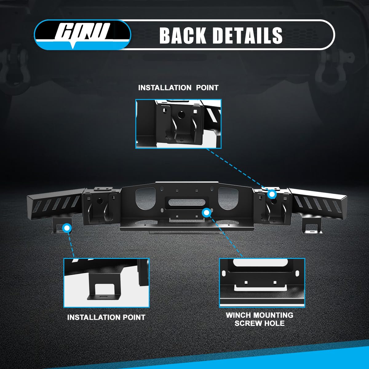 - â ăModular Design Functionă Split modular design front bumper Combination which makes you flexibly install the bull bar, side wings or winch plate according to your needs. This unique modular design gives you enough freedom to flexibly customize your bumper according to your own personal style. At the same time, it also facilitates future upgrades, repairs, or replacement of parts.